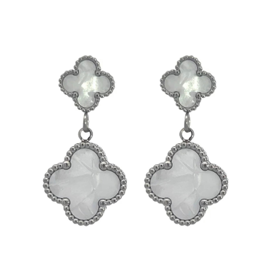 Silver tone Stainless Steel Double Clover stud earings with ivory shell inlay.