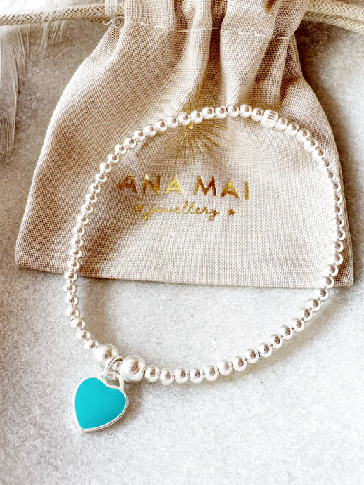 Turquoise Blue Enamel Heart Charm Beaded Bracelet