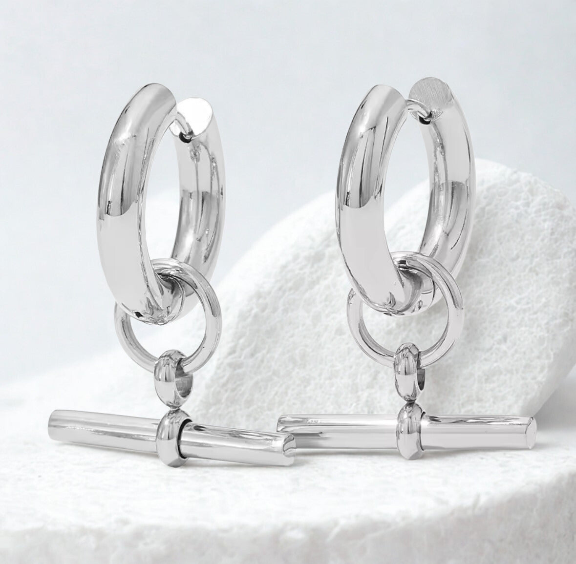 • Load image into Gallery viewer, T Bar Chunky Stainless Steel Huggie Earrings